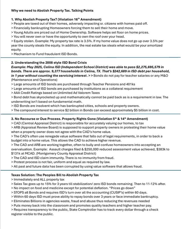 The current system lacks recourse or due process, violating the 5th and 14th Amendments. The Central Appraisal Districts (CADs) use "renegade value software" to inflate home values and generate higher revenue, often in collusion with Appraisal Review Boards (ARBs) to "bully and confuse homeowners." The proposed "Texas Solution and Bill" involves immediately ending all property taxes, temporarily increasing sales tax to 15% (then reducing it to 11-12%), halting all bonds, and requiring ISDs to prove their ability to repay bonds or face bankruptcy. This solution aims to eliminate waste, put money back into classrooms, and ensure financial transparency.